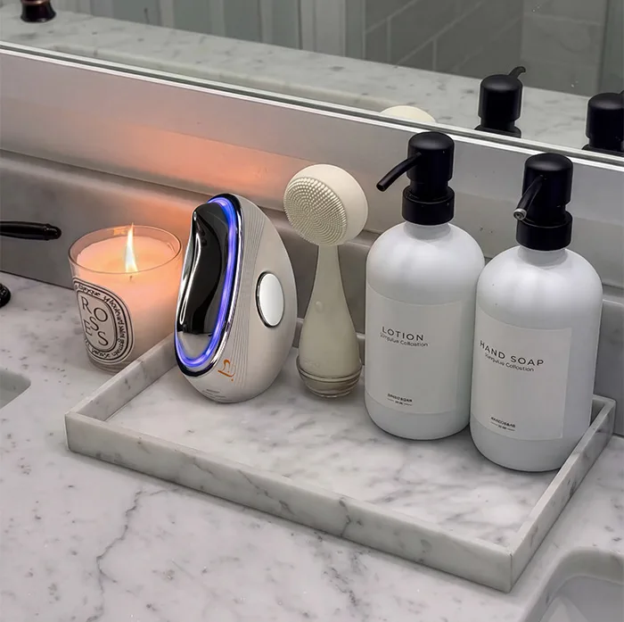 FDA-cleared beauty tech system combining Contrast Therapy, EMS, and Gua Sha to support firmer-looking skin, sculpted facial contours & skin longevity.